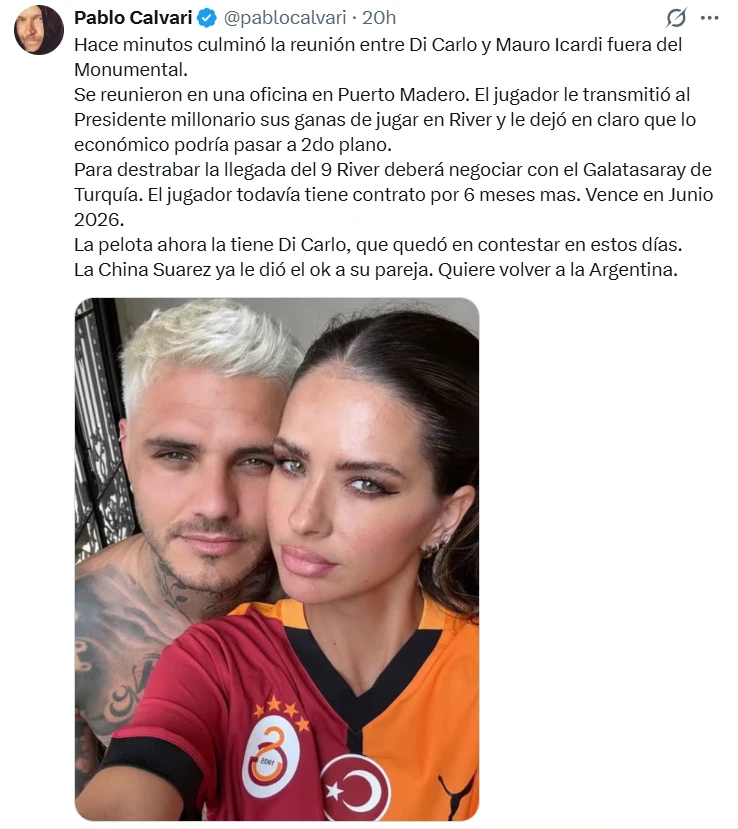 La posibilidad de que Mauro Icardi llegue a River Plate empezó a circular con fuerza en las últimas horas, luego del regreso del futbolista al país para celebrar Navidad en familia con su mujer, Eugenia la China Suárez, los hijos de ella, y las suyas con Wanda Nara, Isabella y Francesca Icardi. Y, como suele ocurrir, el rumor no tardó en salpicar a la China. Todo se originó a partir de un posteo del periodista deportivo Pablo Calvari, quien cubre la actualidad del club millonario y aportó detalles concretos sobre una reunión clave.