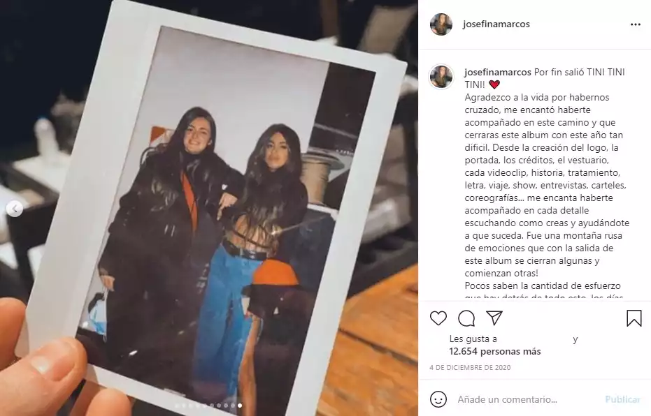 En diciembre pasado, Josefina Marcos le dedicó unas sentidas palabras y detalló cómo es su relación laboral: "Agradezco a la vida por habernos cruzado, me encantó haberte acompañado en este camino y que cerraras este álbum con este año tan difícil. Desde la creación del logo, la portada, los créditos, el vestuario, cada videoclip, historia, tratamiento, letra, viaje, show, entrevistas, carteles, coreografías... me encanta haberte acompañado en cada detalle escuchando como creas y ayudándote a que suceda".
