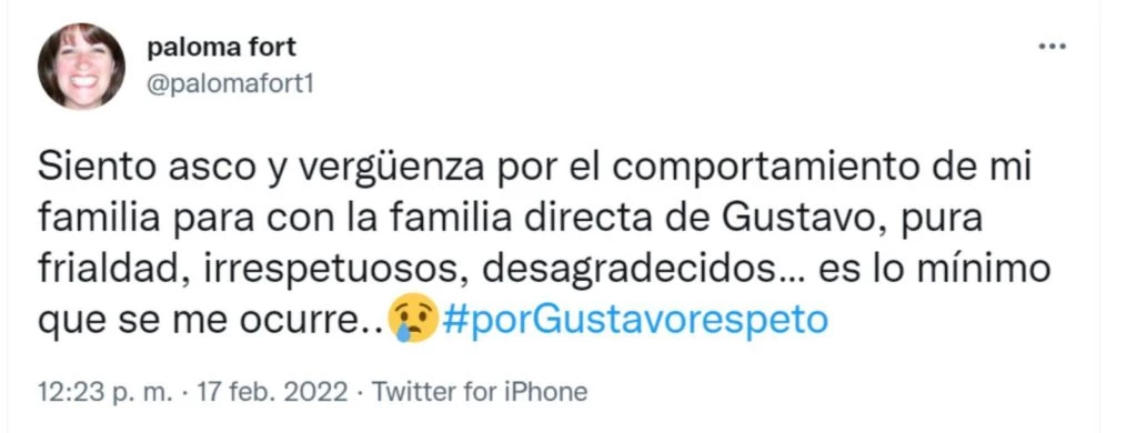 “Siento asco y vergüenza por el comportamiento de mi familia para con la familia directa de Gustavo, pura frialdad, irrespetuosos, desagradecidos…. es lo mínimo que se me ocurre... #porGustavorespeto”. Cabe destacar que la hija de Aschira nunca ha tenido una buena relación con su familia. Incluso aseguró en reiteradas ocasiones que mientras su madre salía con Felipe, era amante de Carlos y que ella sería hija de éste, es decir hermana de Ricardo, Eduardo y Jorge Fort.