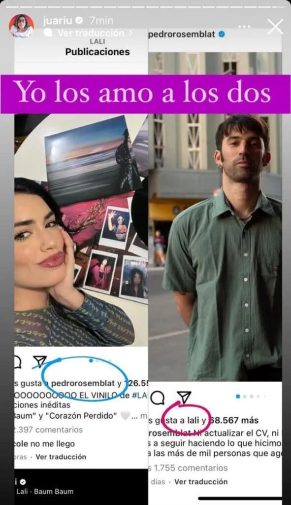 “Me confirmaron que habría habido o habría algo entre Lali y Pedro Rosemblant”, escribió la creadora de Gossipeame, lanzando la bomba. “Yo los amo a los dos”, agregó Juariu con capturas de pantalla de los likes que intercambia la presunta pareja.