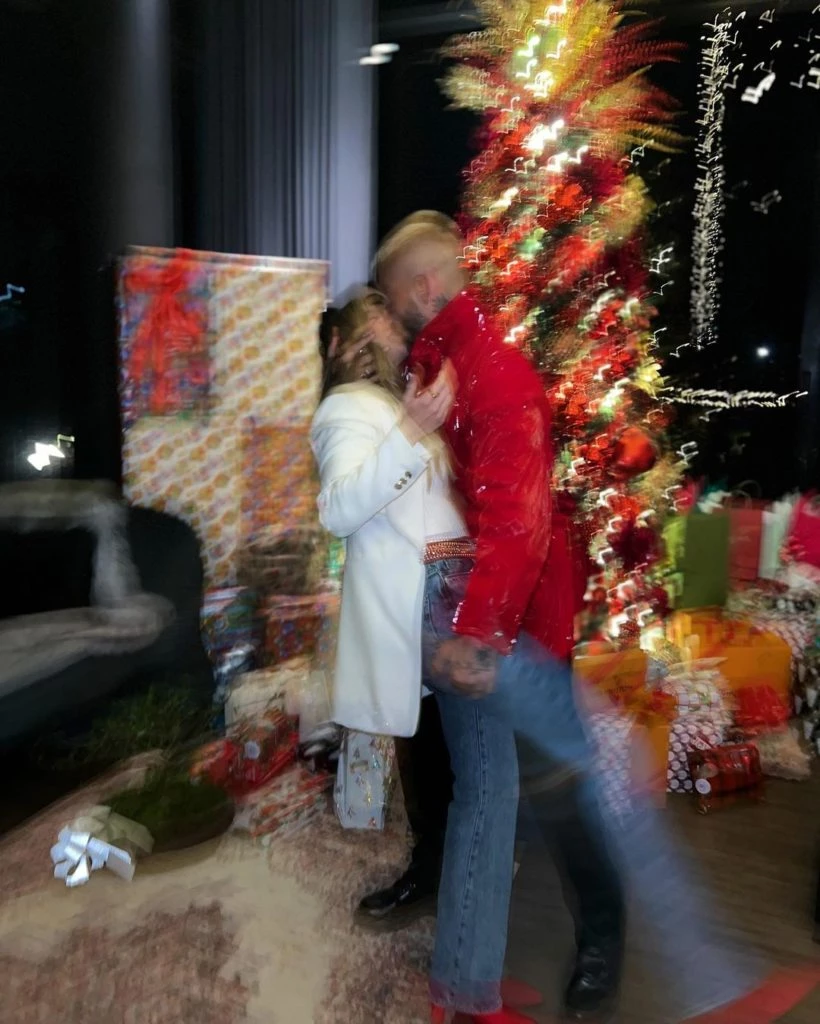 “Gracias Santa”, escribió el cantante junto a un corazón rojo. En la imagen se puede ver a la pareja besándose frente al arbolito navideño lleno de regalos.