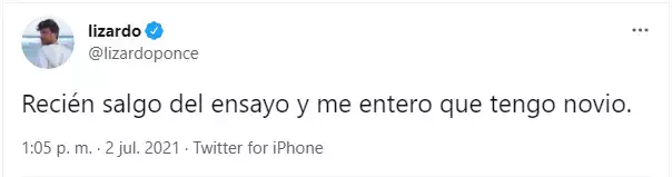 A través de su cuenta de Twitter, Lizardo ironizó con la información que dieron en LAM: "Recién salgo del ensayo y me entero que tengo novio", escribió el participante de La Academia que sorprendió en disco y cosechó 27 puntos del jurado.