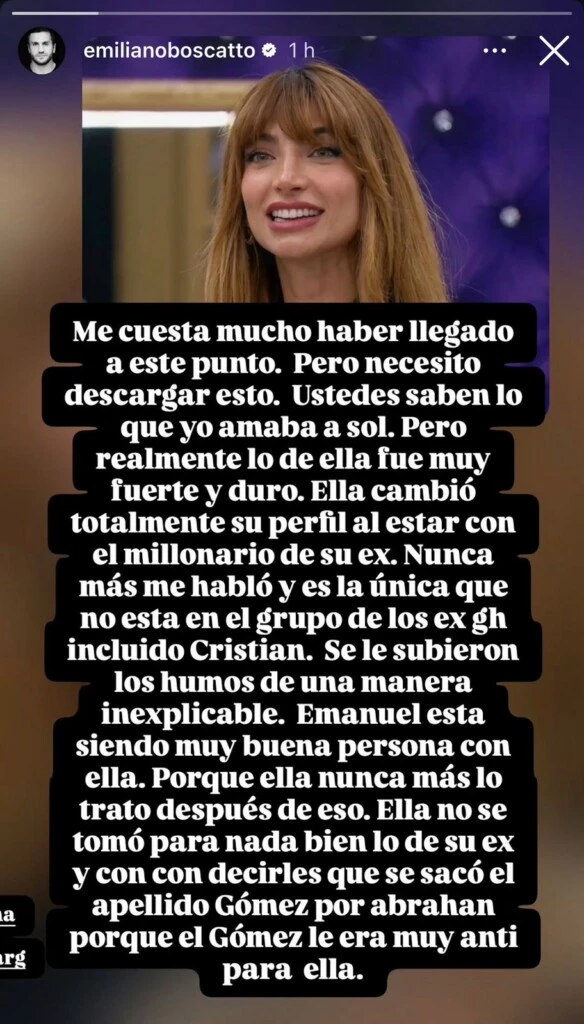 A 15 años de “Gran Hermano 2011”, una de las ediciones más recordadas del reality, Emiliano Boscatto volvió a quedar en el centro de la escena. Desde Madrid, donde se instaló hace años, el exfinalista del ciclo sorprendió con un fuerte comunicado en sus redes sociales en el que apuntó sin rodeos contra Sol Abraham, hoy participante de “GH Generación Dorada”.
