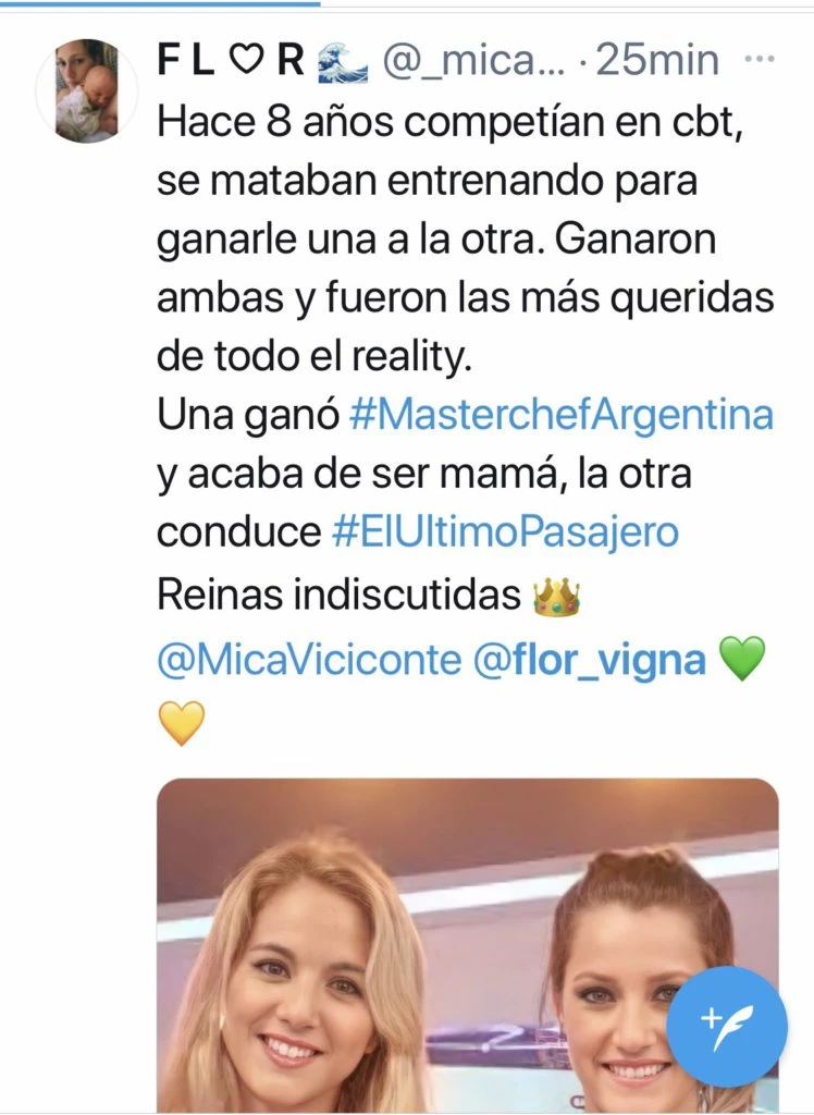 Si bien siempre se dijo que la relación entre Mica Viciconte y Flor Vigna, durante el tiempo que compitieron en el programa Combate, era pésima, la realidad es que ellas hoy se han ocupado de demostar que ésto no era real. De hecho, Flor fue una de las primeras en felicitar a Mica cuando ganó Masterchef Celebrity 3 y también la saludó, muy cariñosamente, cuando nació Luca Cubero.