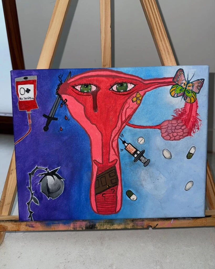 El cuadro compartido por María Becerra parece querer mostrar el padecimiento que la cantante sufrió en los últimos días. En él la artista intenta transmitir, según se ve, un dolor físico, emocional y psicológico relacionado con el sistema reproductor femenino.