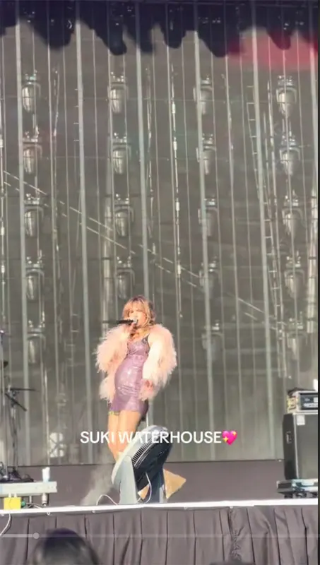 Mientras se frotaba la incipiente panza de embarazada, Waterhouse dijo: "Pensé en ponerme algo brillante para distraernos de otra cosa que me traigo entre manos, pero no estoy segura de si ha funcionado". La referencia a su outfit era clara. La artista portó un minivestido en tono rosa de lentejuelas, abrigo de plumas y botas con flecos.