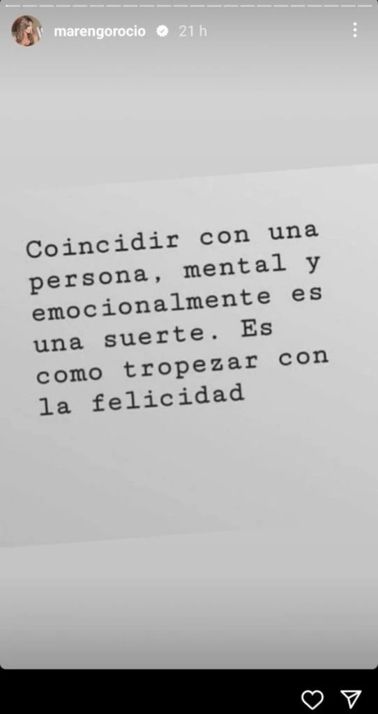 Marengo se refirió en pasado a su vínculo con Eduardo Fort. "Coincidir con una persona mental y emocionalmente es una suerte. Es como tropezar con la felicidad", es la frase que compartió a través del apartado de stories de Instagram.