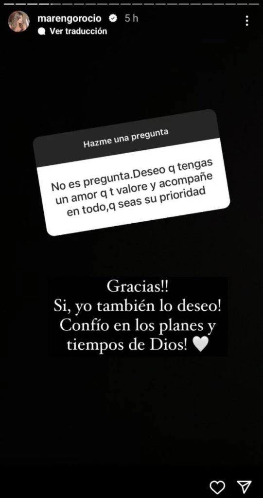 Además, la blonda respondió las consultas de sus fanáticos. "No es pregunta, deseo que tengas un amor que te valore y acompañe en todo, que seas su prioridad", fue una de los mensajes que le escribieron en la cajita de interacciones.