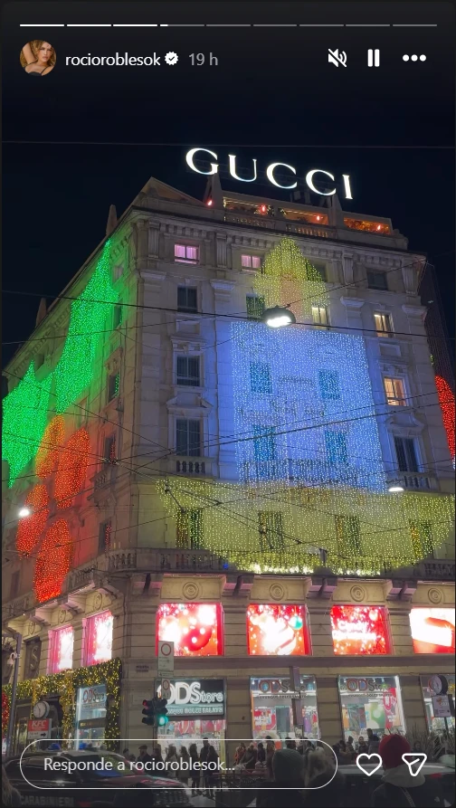 También hubo lugar para el costado más fashion del viaje. En otra publicación, Rocío compartió una postal del icónico edificio de Gucci en Milán, decorado con luces de colores, en plena sintonía con el espíritu navideño europeo.