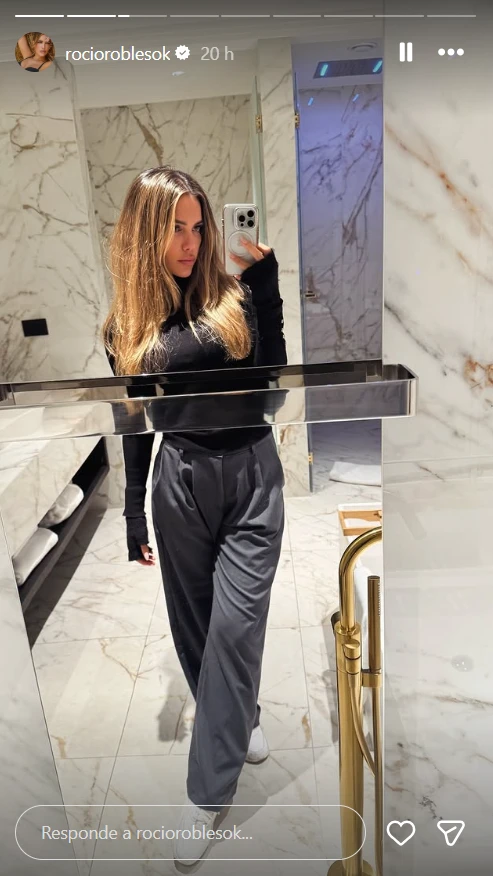 Rocío Robles posó frente al espejo con un outfit cómodo y elegante, desde el hotel donde se hospedó durante su estadía en Italia.