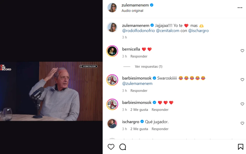 Ante semejante declaracion, Zulemita subió este fragmento de la nota a sus redes sociales y junto a dicho video comentó: "Jajajajaja. Yo te amo más". Y varios emoticones de corazones.