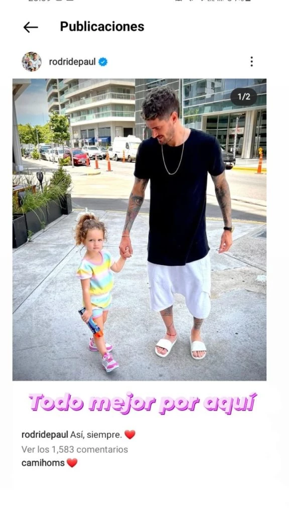 Pese a mostrarse todos muy unidos para las fiestas, ni Rodrigo de Paul ni Camila Homs habían vuelto a pronunciar comentarios o muestras de afecto públicas del uno hacía el otro. Rompiendo el hielo la esposa del futbolista decidió comentar la última publicación del jugador en Instagram con un emoji de corazón rojo. En la imagen el integrante de la Selección Argentina se mostró caminando junto a su hija tomado de la mano y escribió, "Así, siempre".