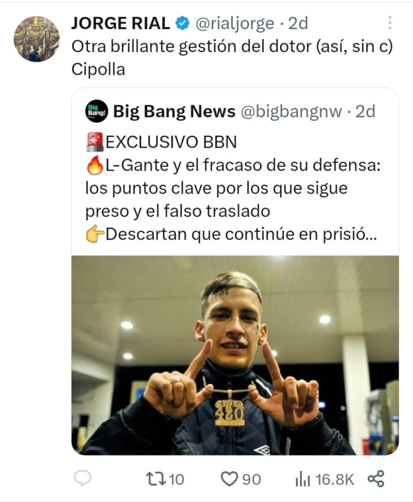 Desde el entorno de la hija de Jorge Rial se confirmó que la pareja habría viajado a los Estados Unidos para terminar de confirmar su romance, que poco agrado le hace a su padre. En los últimos días el conductor de televisión no ha parado de defenestrado al letrado por redes sociales, por su mala gestión en el caso de L-Gante. "Otra brillante gestión del dotor (así, sin C) Cipolla", exclamó sumando un hilo de Twitter en el que se enumerban los puntos por los que el cantante de cumbia 420 sigue preso.
