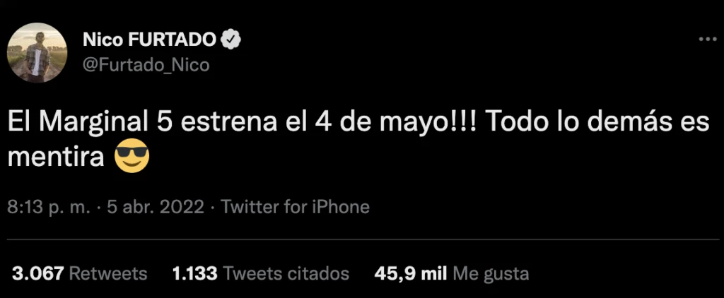 “El Marginal 5 estrena el 4 de mayo. Todo lo demás es mentira”, publicó el escueto mensaje desmintiendo todo tipo de rumor respecto a su relación con la famosa actriz Ester Expósito, quien interpreto a la querida 'Condesa' en la serie española 'Elite'.
