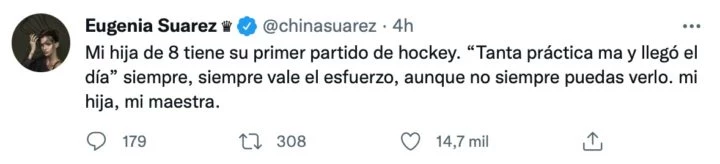“Mi hija de 8 tiene su primer partido de hockey. ‘Tanta práctica má y llegó el día’. Siempre, siempre vale el esfuerzo, aunque no siempre puedas verlo. Mi hija, mi maestra”, escribió María Eugenia Suárez orgullosa en su red social.