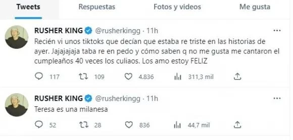 Atento a estos comentarios, el cantante hizo su descargo en las redes sociales y explicó el motivo de su "mala cara" al momento en que sus amigos le cantaron el 'Feliz cumpleaños'. "Recién vi unos tiktoks que decían que estaba re triste en las historias de ayer. Jajajajaja, estaba re en pedo. Y como saben que no me gusta (que me canten el feliz cumpleaños), me cantaron el cumpleaños 40 veces los culiaos. Los amo. Estoy feliz", tuiteó Rusher, explicando su situación actual.
