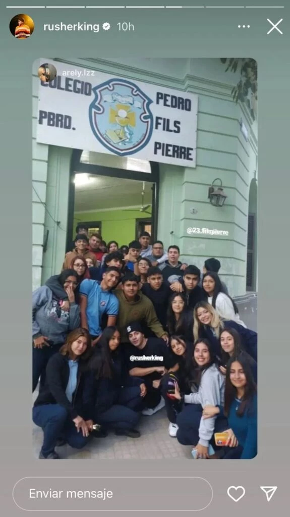 En la tarde del viernes -la previa de su cumpleaños- Rusher se hizo presente en el Colegio Secundario Presbítero Pedro Fils Pierrede la ciudad de La Banda, donde cursó sus estudios secundarios. Allí se encontró con los actuales alumnos, charló con ellos y se tomó fotos. “Qué hermoso volver a mi colegio y que me reciban así. Qué emoción, loco, gracias”, escribió en redes sociales.