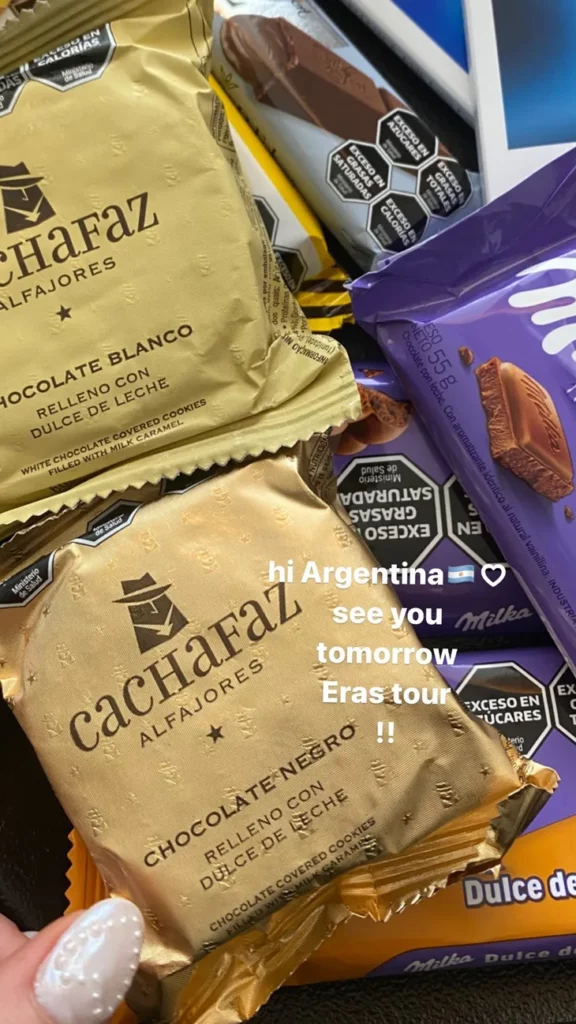 En una historia de Instagram Sabrina Carpenter dijo: "Hola Argentina, nos vemos mañana. ¡Eras Tour!", y sumó una foto de sus compras en un kiosco. Entre ellas se encontraban gran variedad de alfajores de dulce de leche y chocolates, con los que la artista estadounidense quedó fascinada.