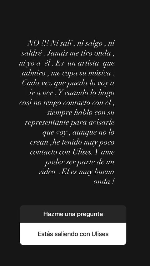 “¿Estás saliendo con Ulises?”, le consultó un internauta. A lo que sorprendida Sabrina respondió: “¡¡No!! No salí, ni salgo, ni saldré. Jamás me tiró onda, ni yo a él. Es un artista que admiro, me copa su música. Cada vez que pueda lo voy a ir a ver”.