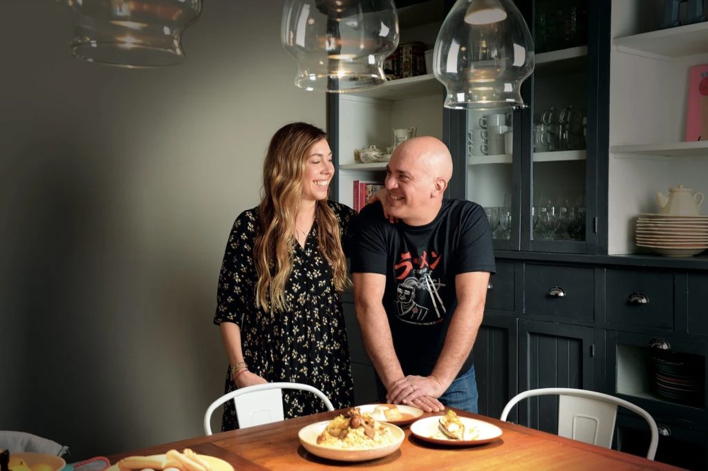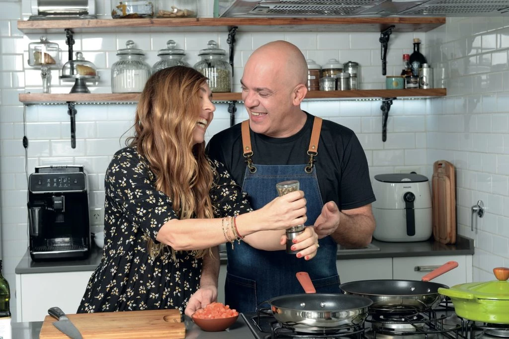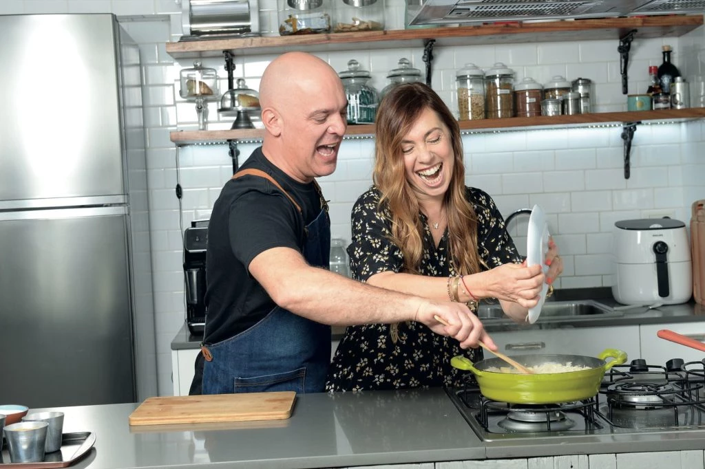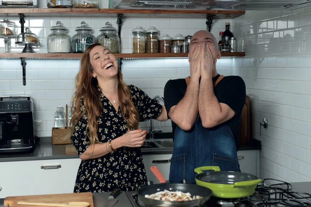 “Mis seguidoras saben que yo no sé hacer ni un huevo pasado por agua. Sin embargo, les aseguro que la que ordena y lava los platos en esta casa soy yo”, afirma con ímpetu Juliana mientras su marido va sacando los ingredientes de la heladera familiar, que en sus estantes –como es habitual– revela delicias como un budín de chocolate y una cheesecake de frutos rojos “que ya se pueden comer” (lo que aún no, se encuentra en otra heladera, ubicada en una cercana segunda cocina, que Santi ideó en el 2020 para trabajar sin estresar a su familia).