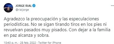 "Agradezco la preocupación y las especulaciones periodísticas. No se sigan tirando tiros en los pies ni revuelvan pasados muy pisados. Con dejar a la familia en paz alcanza y sobra", escribió Rial.