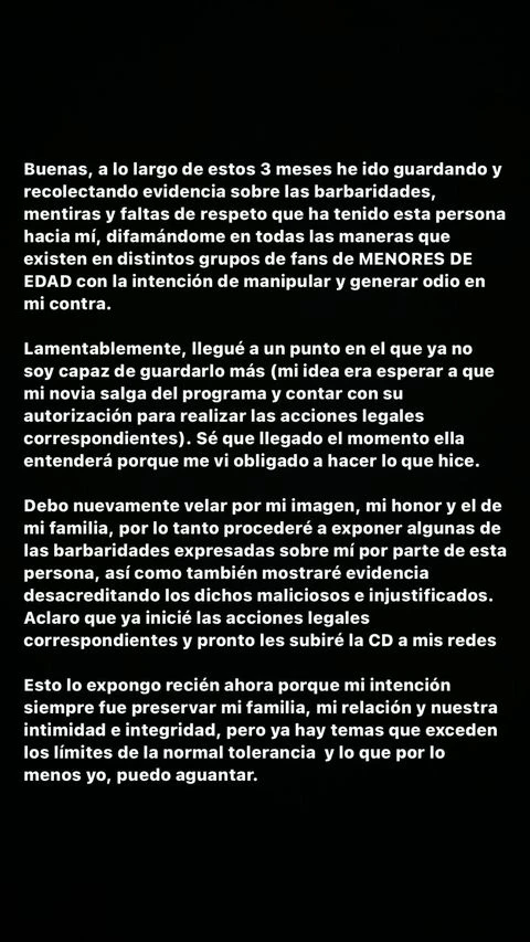“Lamentablemente, llegué a un punto en el que ya no soy capaz de guardarlo más (mi idea era esperar a que mi novia salga del programa y contar con su autorización para realizar las acciones legales correspondientes). Sé que llegado el momento ella entenderá porque me vi obligado a hacer esto”, continuó apenado por tomar protagonismo, cuando es su novia la que concursa en GH.