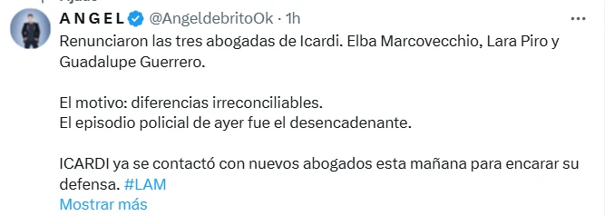 Es que según confirmó Ángel de Brito en sus redes sociales, las tres abogadas del deportista, Elba Marcovecchio, Lara Piro y Guadalupe Guerrero, renunciaron a su defensa. "El motivo: diferencias irreconciliables. El episodio policial de ayer (por el de este viernes) fue el desencadenante. Icardi ya se contactó con nuevos abogados esta mañana para encarar su defensa", comunicó el periodista en su cuenta de X (ex Twitter) este sábado a la mañana.