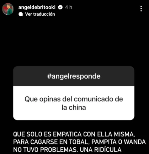 Asimismo, sobre el descargo que escribió la China, Ángel opinó: “Sólo es empática con ella misma. Para cagarse en Tobal, Pampita o Wanda no tuvo problemas. Una ridícula”.