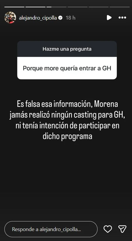 La aclaración llegó luego de que un usuario le preguntara directamente por qué Morena querría ingresar a la casa más famosa del país. Frente a ese planteo, Cipolla respondió sin rodeos y calificó la información como falsa. “Es falsa esa información”, aseguró. Y luego, remarcó: "Morena jamás realizó ningún casting para Gran Hermano, ni intención de participar en dicho programa".