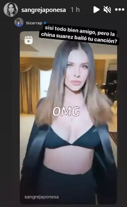 El productor musical del momento subió a sus historias una foto en la que escribió: “Sí, sí, todo bien amigo, pero ¿La China Suárez bailó tu canción?”, se preguntó a modo de chiste junto con un gift de OMG halagándola a ella y también felicitándose a él.