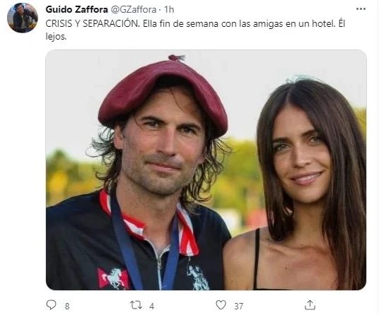 "Crisis y separación. Ella fin de semana con las amigas en un hotel. Él lejos", escribió Zaffora quien fue el primero en afirmar este noticia. Si bien no puso el nombre de las personas, acompañó el tweet con una fotografía de la pareja.