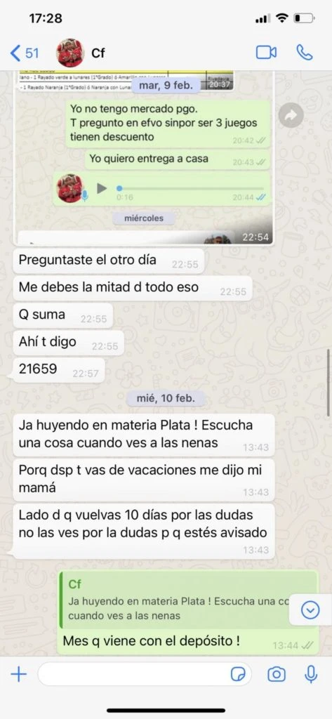 La siguiente captura es del 10 de febrero. En esta ocasión la bailarina le dijo que le correspondía pagar 21.659 pesos y, como no respondió, le agregó: “Ja, siempre huyendo en materia plata”.