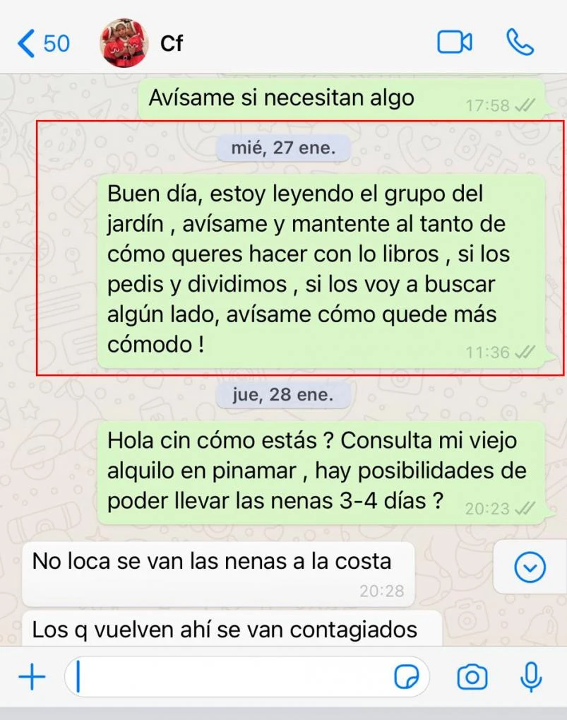 “Miércoles 27 de enero mientras seguía en el grupo del jardín. Leí eso y me puse a disposición de ella y los libros para las nenas. No tuve respuesta”, escribió el jugador en Twitter junto al chat que lo demuestra.
