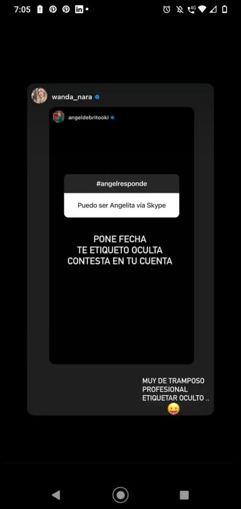 Hace unas horas Wanda Nara hizo una oferta tentadora para cualquier programa de espectáculos argentino. La modelo al ver que Ángel de Brito había lanzado una caja de preguntas en su Instagram le consultó al pasar, “Puedo ser Angelita vía Skype?”.
