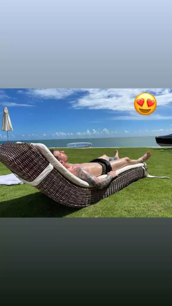 Y la segunda foto que eligió compartir la rosarina estuvo dedicada por completo a su marido a quien capturó mientras disfruta del sol recostado en una reposera, con el paisaje de la playa de Florida de fondo.