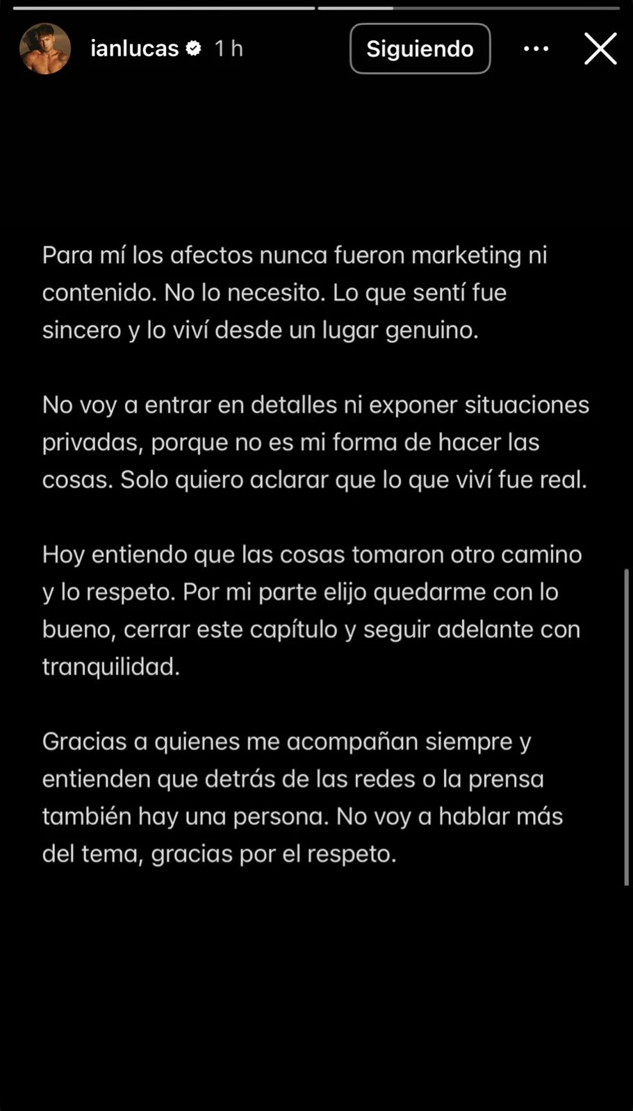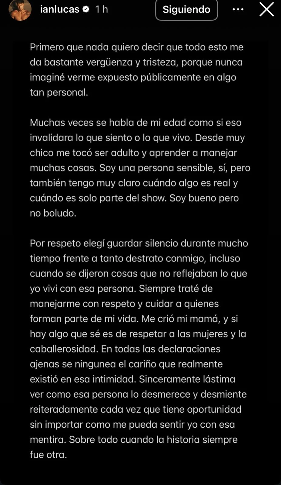 En otro fragmento del mensaje, Lucas remarcó que lo que vivió fue genuino y que nunca buscó convertir la relación en un tema mediático. “Para mí los afectos nunca fueron marketing ni contenido. No lo necesito. Lo que sentí fue sincero y lo viví desde un lugar genuino”, escribió.