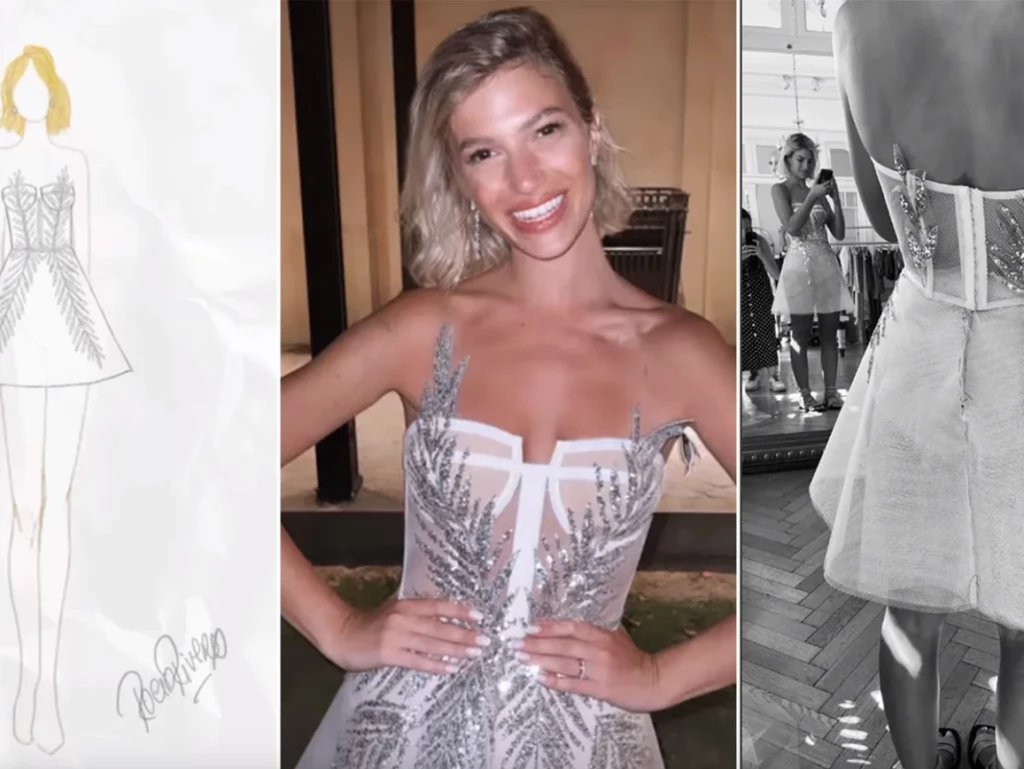 El diseño principal fue una creación de la marca Guevara Ocampo (Justo Guevara y Belén Ocampo). Roitman lució un micado acompañado de una falda armada con gran cola, que tenía corte en la cintura y strapless con mangas, las cuales caían por debajo de los hombros. Por último, sumó un velo de tul con puntilla de encaje.