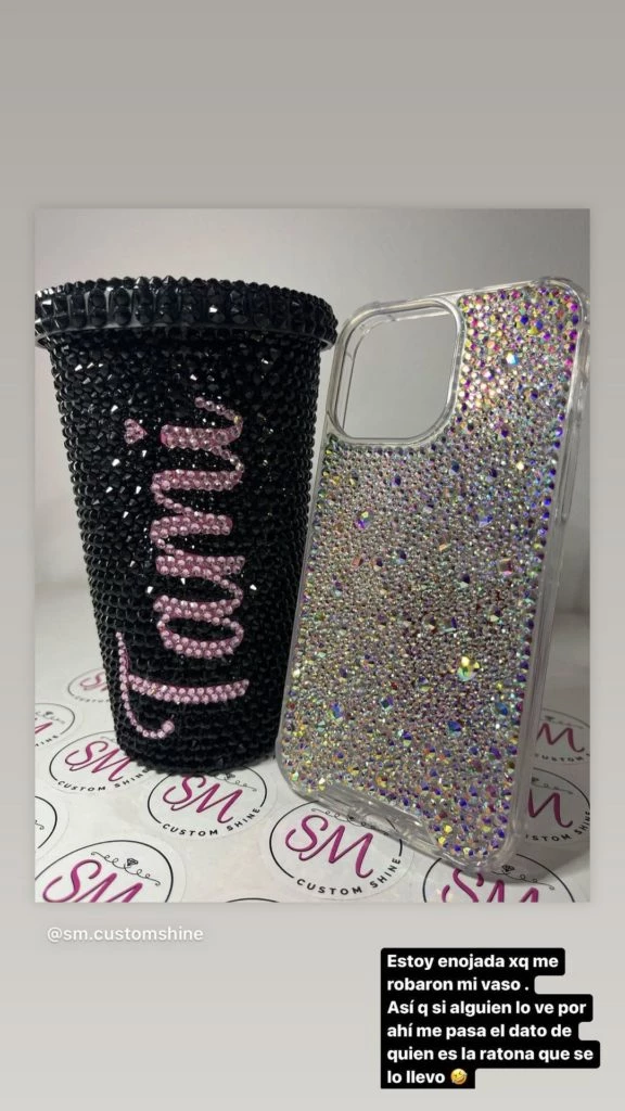 En distintas imágenes mostró cómo era su vasito de brillantes negro, que tenía grabado su nombre de forma personalizada. El mismo venía con una funda para celular de brillos a juego que la joven utilizaba diariamente.