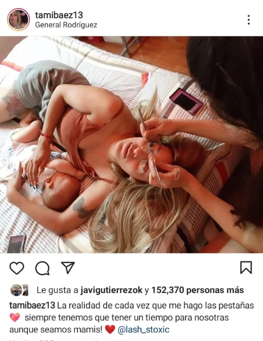 Es por esto que decidida a poder cambiar la mirada a veces crítica contra las madres que asisten a los centros de belleza con sus hijos, compartió un posteo en el que mostró la forma particular en la que es atendida. Acostada sobre una cama Tamara Báez se realiza su tratamiento de pestañas mientras amamanta a Jamaica. "La realidad de cada vez que me hago las pestañas. Siempre tenemos que tener un tiempo para nosotras aunque seamos mamis!", escribió Baez en el pie de la imagen.