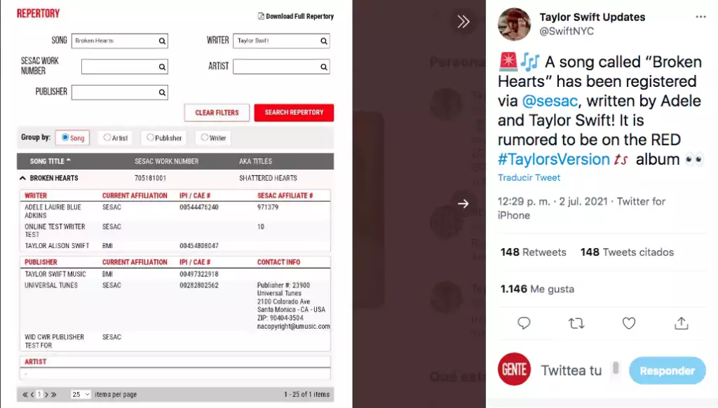 Según un screenshot que tomó un fan de la Society of European Stage Authors and Composers (SESAC), las superstars registraron juntas una nueva canción llamada Broken Hearts.