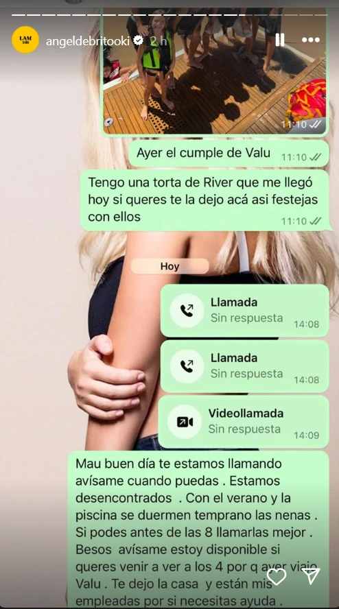 Ángel de Brito fue quien filtró esas conversaciones este miércoles en sus historias de Instagram y a juzgar por el contenido de las mismas, son charlas que se habrían dado en los últimos días por los cumpleaños de Francesca y Valentino.
