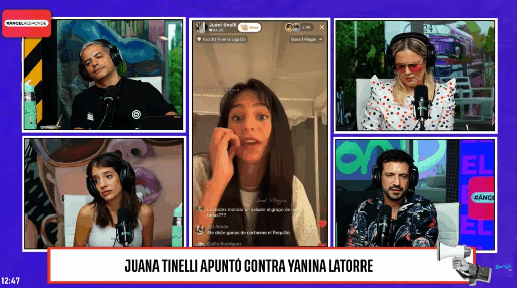 “Juanita Tinelli agarró el Instagram otra vez y disparó contra Yanina Latorre y Soledad Aquino…”, informó este miércoles Ángel de Brito al aire de Bondi, antes de que su producción pusiera al aire el recorte del video con las declaraciones de la hija de Marcelo Tinelli.