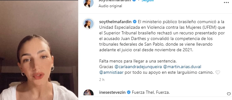 "El ministerio público brasileño comunicó a la Unidad Especializada en Violencia contra las Mujeres (UFEM) que el Superior Tribunal brasileño rechazó un recurso presentado por el acusado Juan Darthes y convalidó la competencia de los tribunales federales de San Pablo, donde se viene llevando adelante el juicio oral desde noviembre de 2021", escribió Thelma en sus redes sociales y agregó: "Falta menos para llegar a una sentencia".