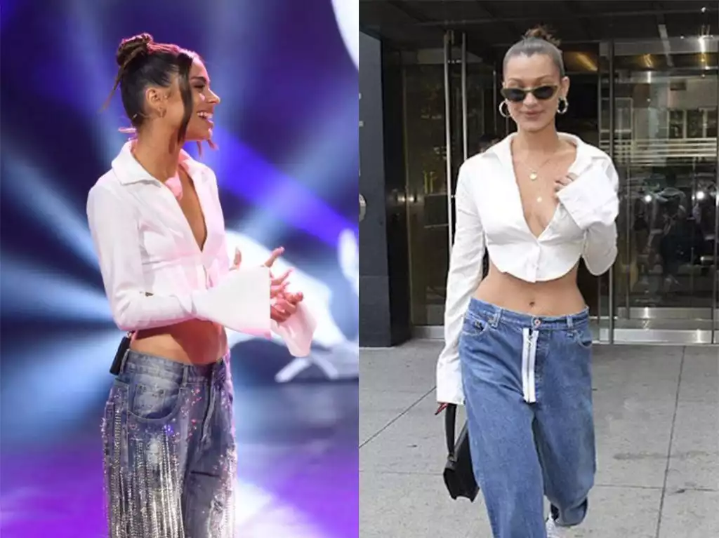 La vestuarista de Tini claramente se remitió a un viejo estilismo de Bella Hadid. En la siguiente fotografía y durante un paseo por New York en 2017, la top model lució unos jeans anchos de tiro muy bajo firmados por Off White y combinados con una camisa blanca croppeada idéntica a la que vistió Tini anoche, con enormes puños, escote profundo y terminación ovalada.
