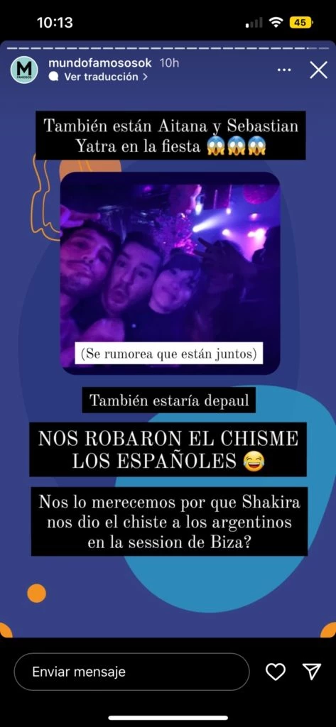 Por otro lado, Sebastián Yatra, ex de Tini, también estuvo en la misma fiesta junto a la cantante italiana Aitana con quien se lo vincula sentimentalmente desde hace un tiempo. "También están Aitana y Sbeastián Yatra en la fiesta (se rumorea que están juntos). También estaría De Paul. Nos robaron el chisme los españoles", escribió @mundofamososok, junto a una fotografía del cantante colombiano y su presunta pareja.
