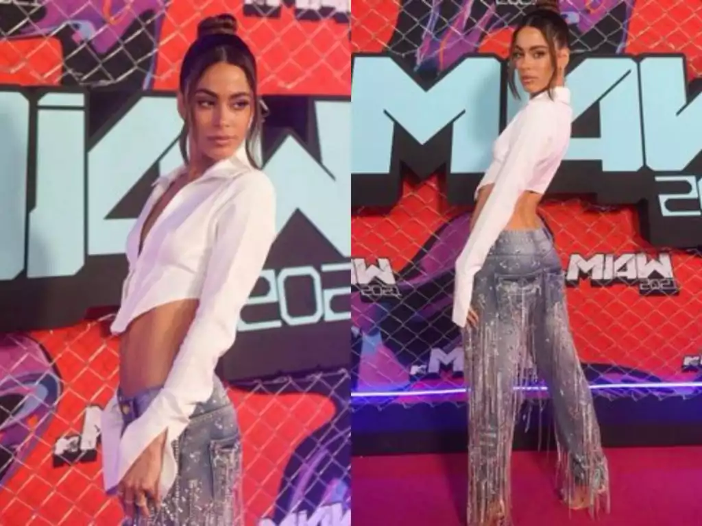 Fiel a su estilo, Tini lució un top con mangas largas que dejaba ver su vientre en tono blanco, jean tiro bajo en color gris con brillos y detalles, zapatos altos en tono nude.