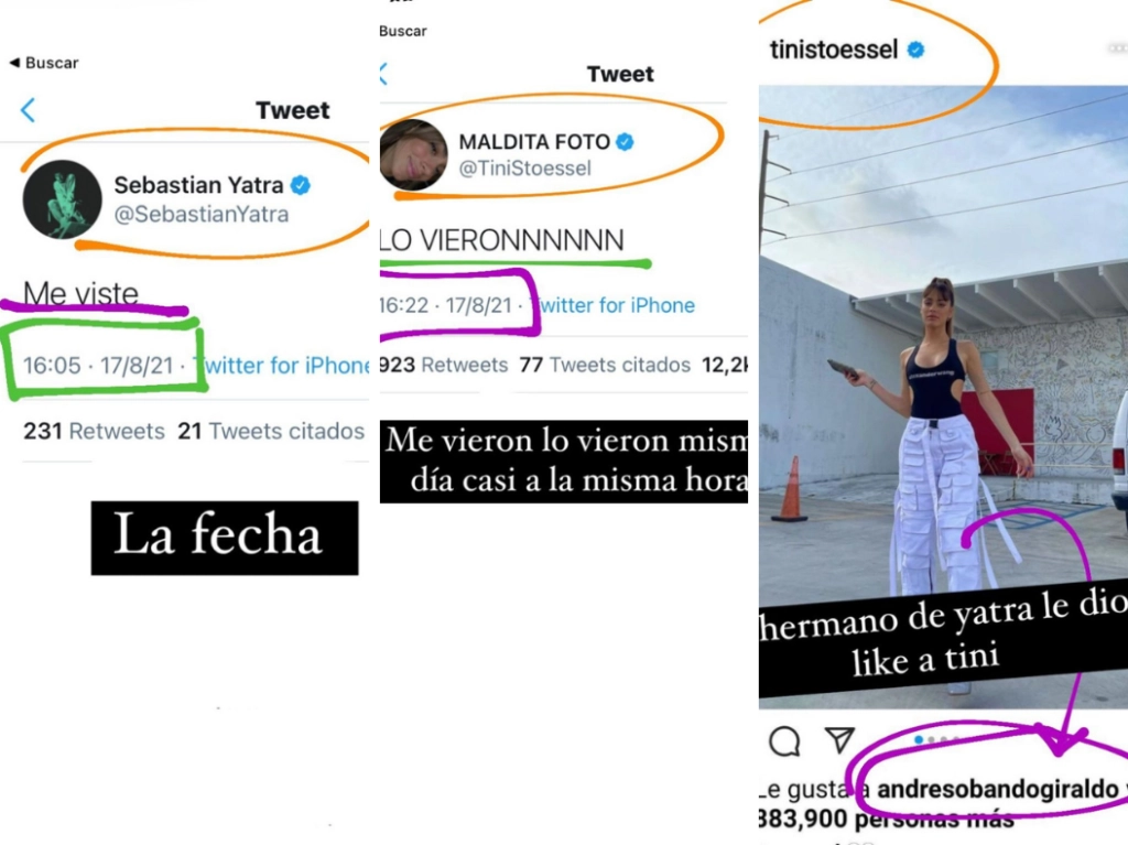 Para finalizar, la 'stalkeadora de famosos' reveló que el pasado 17 de agosto tanto el artista colombiano como la intérprete de 'Miénteme' tuitearon frases similares en el mismo rango horario. Como si esto fuera poco en el día de ayer Andres Obando, hermano de Sebastián Yatra, likeó el posteo de Tini Stoessel en Instagram.