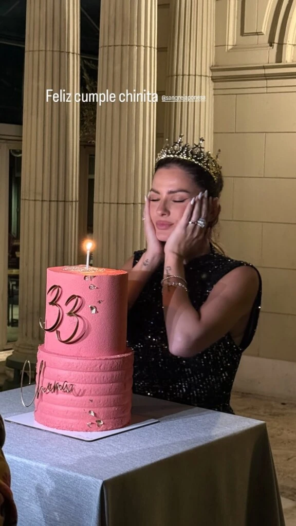 Antes de finalizar la noche, llegó el momento de la torta, y la China se puso delante de la mesa, con una corona de reina, para soplar las velitas. La increíble torta de cumpleaños era de dos pisos altos, toda rosa, con el número 33 y un 'China' en dorado.