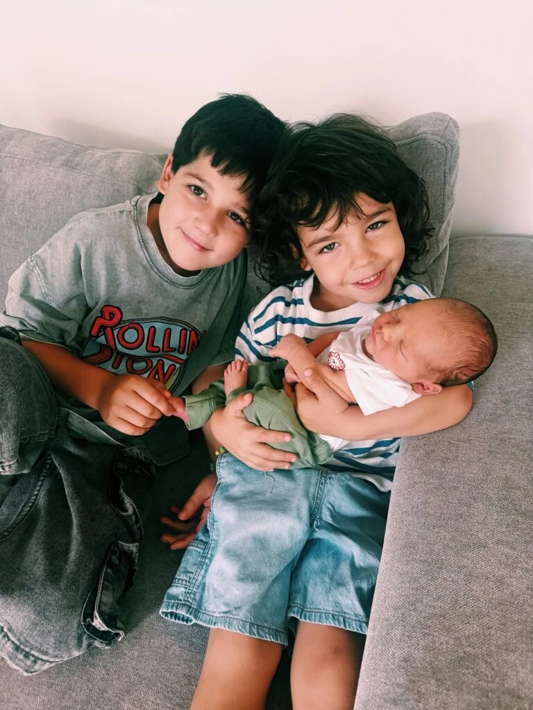 En la segunda imagen, los hermanos mayores posaron juntos sosteniendo con cuidado al bebé. Sonrieron a cámara con complicidad y orgullo, dejando ver la emoción por la llegada del nuevo integrante.