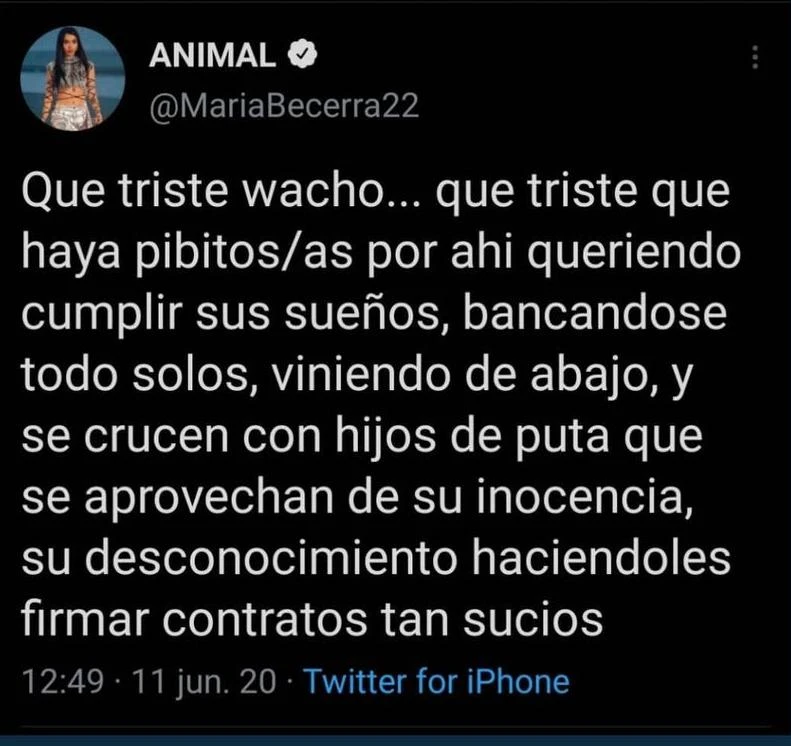 En su mensaje, que muchos consideraron "tibio", Becerra explicó: "Mi intención no es estar metida en quilombos contractuales, discográficos o de managers. Simplemente soy una artista y como todos estoy constantemente buscando la forma de crecer artísticamente, tener más experiencia y conocimientos".